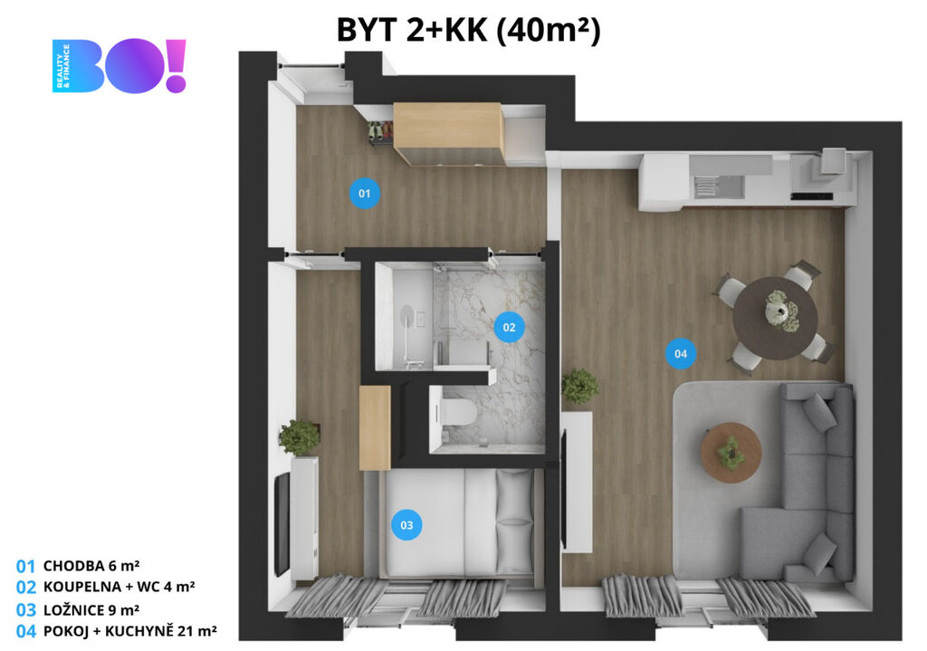 Světlý obývací pokoj s kuchyňským koutem - srdce bytu pro společné chvíle i klidný odpočinek. Ložnice poskytující soukromí a klid.