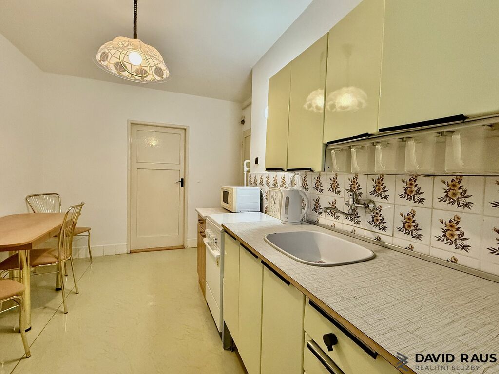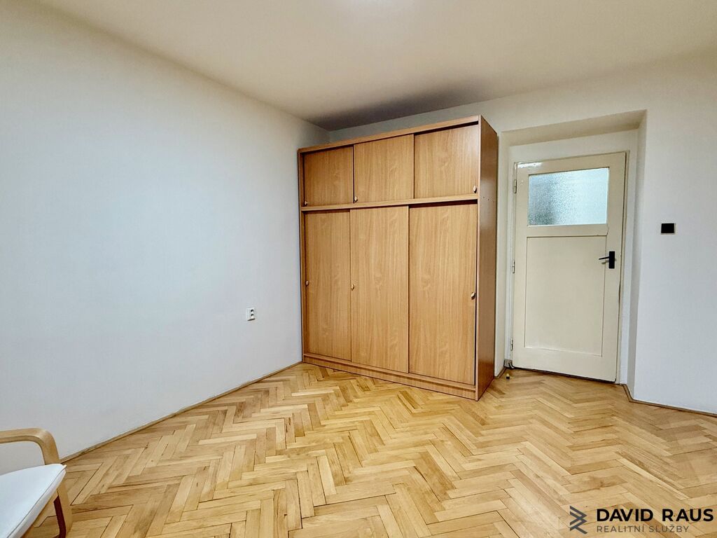 Dispozice bytu: Do bytu vstupujeme hlavním vchodem do chodby, která nabízí menší skříňku a nástěnný věšák se zrcadlem. Z chodby je po pravé straně vstup do prvního pokoje, kde se nachází prostorná šatní skříň a menší prosklená skříňka. Z chodby také vstupujeme do kuchyně, která je částečně vybavená starší kuchyňskou linkou, plynovým sporákem, lednicí a jídelním stolem. Z kuchyně se dále vchází do druhého pokoje. V kuchyni je také odvětrávaná spíž, vhodná pro uskladnění potravin. Z chodby je přístupná i koupelna společně s WC, kde je umístěna pračka, a vedle koupelny se nachází menší komora.