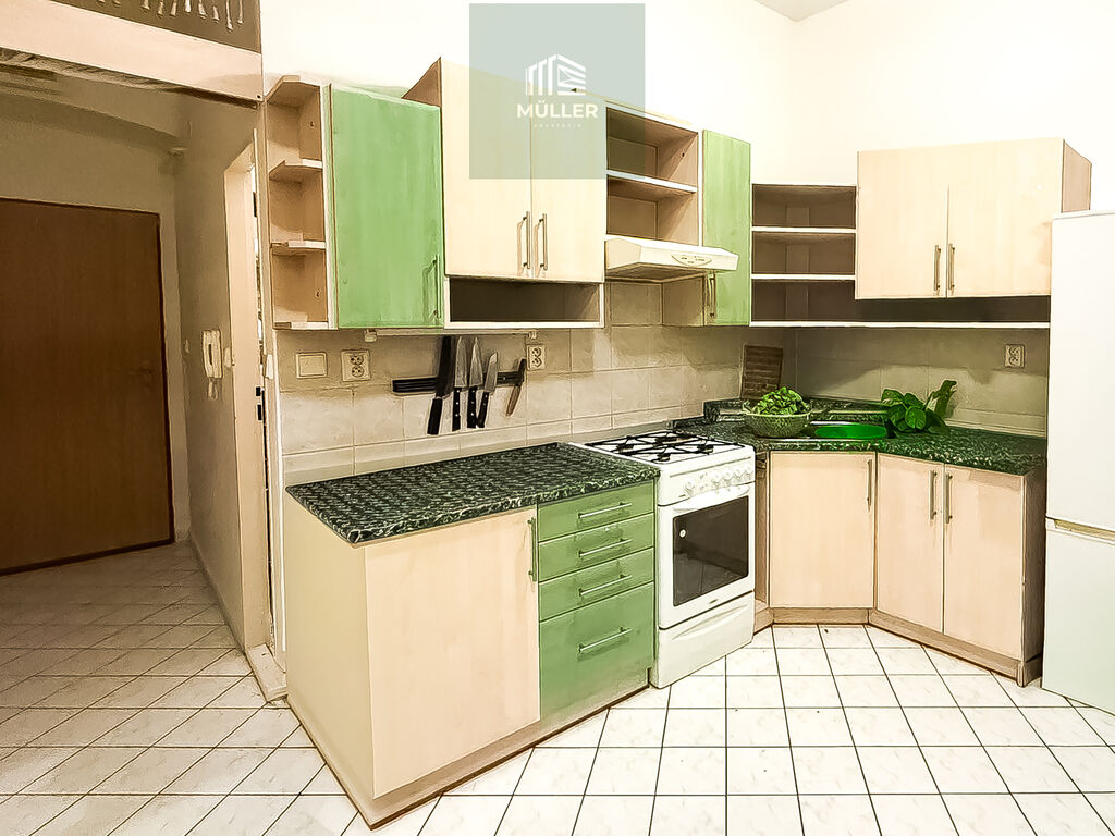 Byt vyniká svými vysokými stropy a zajímavým půdorysem, který nabízí dostatek prostoru i pro větší rodinu.
