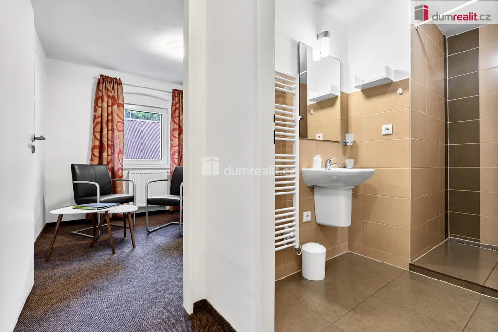 V přízemí domu je společenská místnost a jídelna v jednom, kuchyň, spíž, technická místnost, WC rozdělené na dámské a pánské, 1 samostatný pokoj a 1 pokoj s vlastním sociálním zařízením.