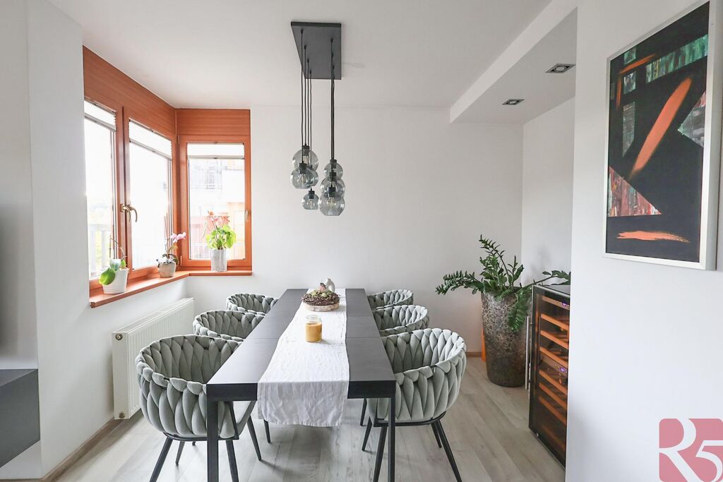 Byt má prostorný obývací pokoj s jídelnou má 48m2 a k dispozici je plně vybavená kuchyňská linka, hlavní ložnici s koupelnou (sprchový kout, toaleta) a vestavěnými skříněmi, druhou ložnici, samostatnou koupelnu (vana), samostatnou toaletu, technickou komoru a otevřenou vstupní halu s vestavěnými úložnými prostory. Terasa je přístupná z obývacího pokoje a hlavní ložnice. Nábytek je stávajícího nájemníka.