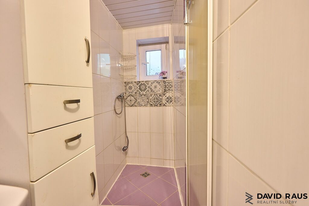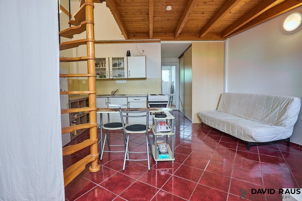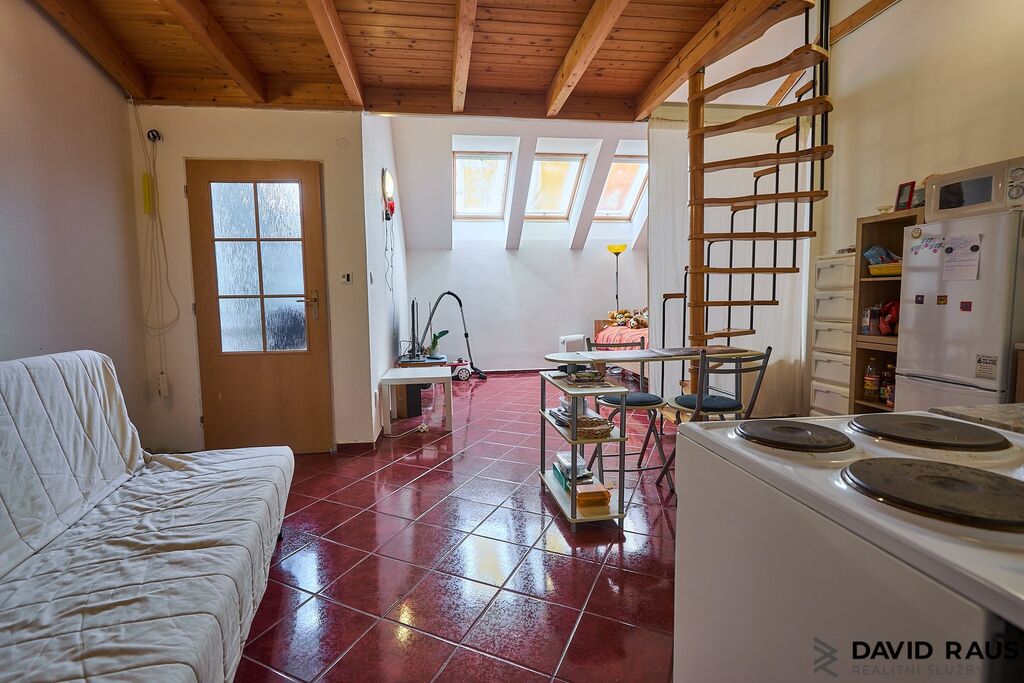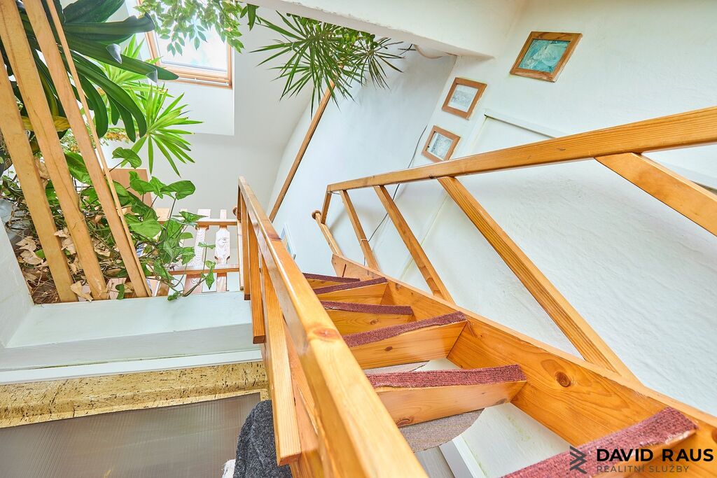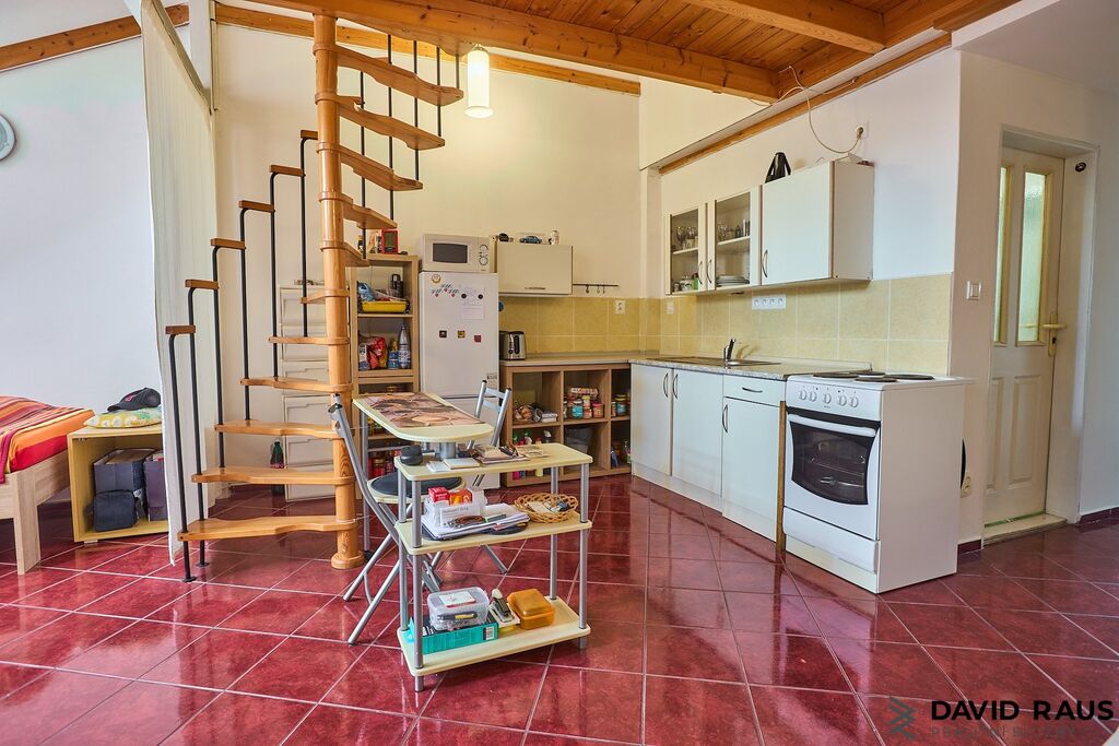 Dispozice domu: Po vstupu do domu se ocitnete v menší zádveří, odkud po dřevěném schodišti vystoupáte do horní bytové jednotky. Zde se nachází světlý obývací pokoj s kuchyňským koutem, který působí vzdušně a útulně. Z obývací části vede schodiště na vyvýšené spaní (palandu), které prakticky využívá prostor pod střechou. Součástí tohoto bytu je koupelna s vanou a WC, vestavěná skříň a také vstup na zasklený balkon – menší zimní zahradu, která nabízí příjemné posezení během celého roku. Dispozice horní jednotky odpovídá atypickému bytu 2+kk.Po návratu po schodišti zpět do přízemí se naproti vstupním dveřím nachází vstup do druhé bytové jednotky. Ta vás uvítá obývacím pokojem, který je propojen s ložnicí i kuchyní. Z kuchyně je vstup do koupelny se sprchovým koutem, a zároveň vede průchod přes malé atrium na prostornou zahradu.