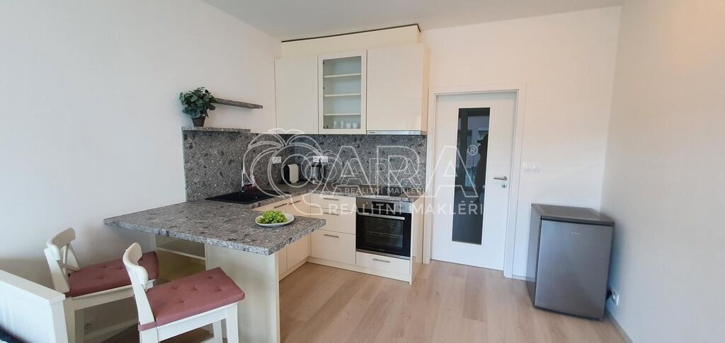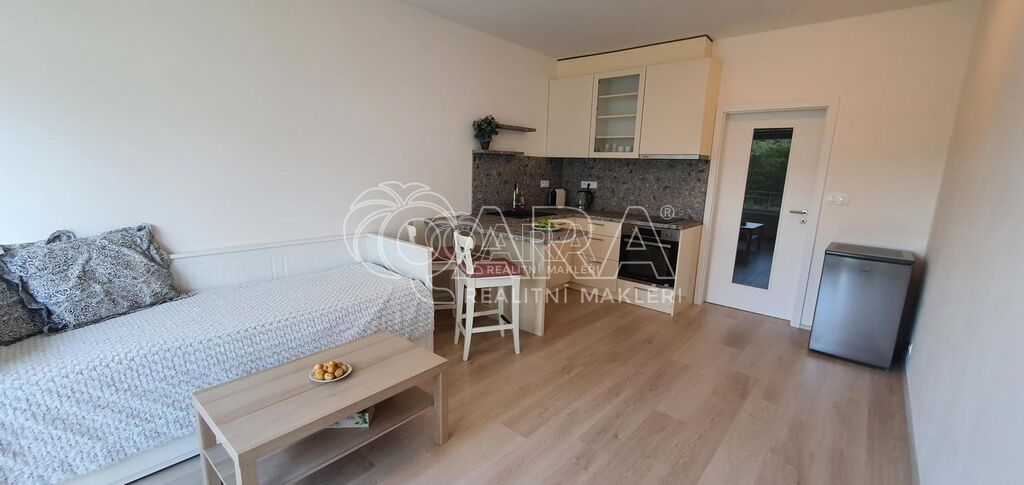 Nabízíme Vám nový, prostorný byt o dispozici 1+kk s lodžií a sklepem v novostavbě v Praze - Hodkovičkách. Byt má užitnou plochu 32 m2 a nachází se ve 3 nadzemním podlaží. Vnitřní dispozice bytu: vstupní chodba, ze které je vstup do koupelny s vanou, která je společná s toaletou. Z chodby je vstup do pokoje s kuchyňským koutem a posezením. Byt je vybaven nábytkem. Na chodbě disponuje velká šatní skříň s úložným prostorem. Kuchyňská linka, která je vyrobena na míru od truhláře, je vybavena vestavěnými spotřebiči a samostatnou lednicí s mrazákem, barovým stolem se 2 židlemi, rozkládacím gaučem s konferenčním stolkem. Lodžie je vybavena zahradním nábytkem ( 2 křesílka a stolek). Koupelna je též vybavena skříňky.