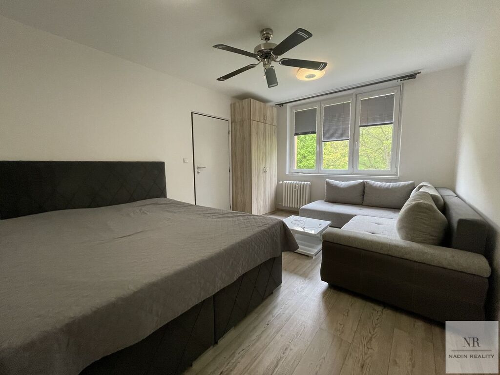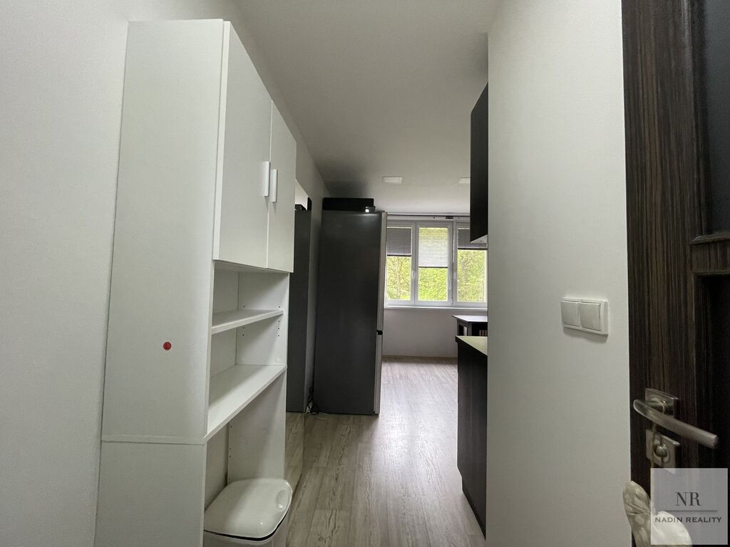 Dispozice bytu zahrnuje vstupní chodbu, prostornou kuchyni, ložnici a koupelnu se sprchovým koutem a toaletou. Byt se pronajímá částečně zařízený, přičemž vybavení odpovídá fotografiím uvedeným v nabídce.