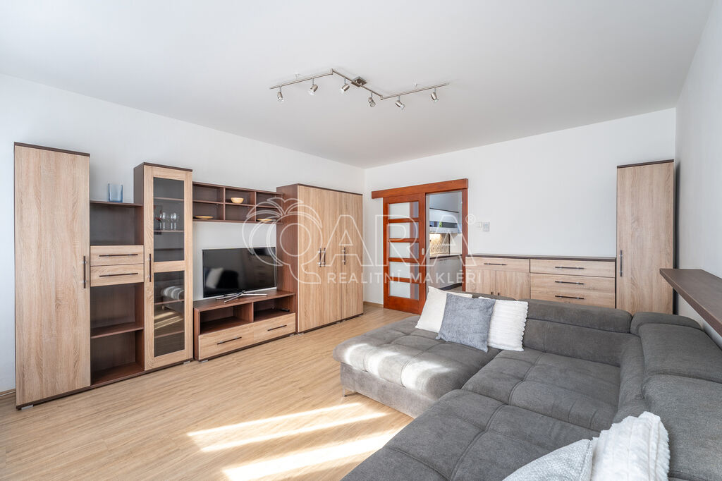 Jedná se o bytovou jednotku o výměře 48 m², která se nachází v 1. patře cihlového domu s pouze sedmi bytovými jednotkami. Byt se skládá z předsíně, kde je k dispozici spousta úložných prostor. Předsíň je spojená s kuchyní, kde je kuchyňská linka s lednicí a mrazákem, elektrickou troubou s plynovým sporákem i mikrovlnnou troubou. Dále je k dispozici jídelní stůl s židlemi. Z místnosti se po dřevěných schodech dostaneme do spacího patra s matracemi s výhledem do tichého vnitrobloku. Z kuchyně je přístupný i samostatný obývací pokoj, který je zařízen rozkládací sedací soupravou do U, obývací stěnou s TV a komodami. Koupelna je přístupná z předsíně a je vybavena sprchovým koutem, umyvadlem a WC. Přípojka na pračku je samozřejmostí, ovšem pračka není součástí podnájmu. Jako bonus je zde i samostatná šatna/spižírna. Po domluvě je zde možnost využívání společného vnitrobloku. K dispozici je i sklep.