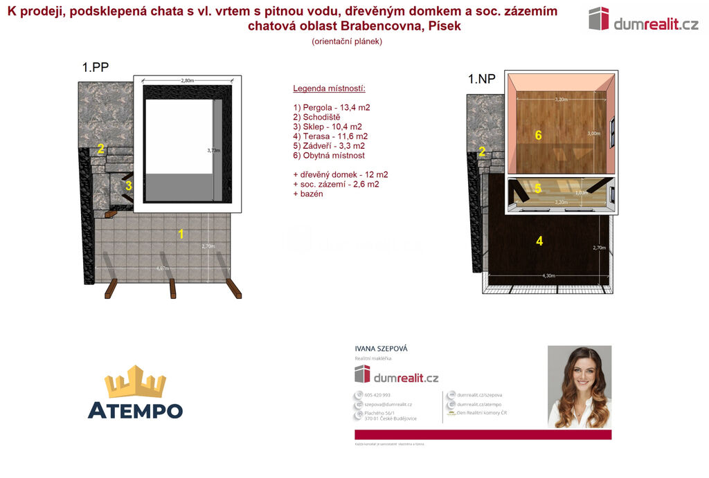 Dumrealit.cz Vám zprostředkuje prodej podsklepené chaty s terasou s výhledem na město, pergolou, vlastním vrtem s pitnou vodu, elektřinou a pozemkem o celkové výměře 335 m² na okraji klidné zahrádkářské kolonie Brabencovna, jen 5 minut od centra Písku. Součástí prodeje je pozemek parc.č. 1402/28 o výměře 335 m² a pozemk parc. č. st. 4473 o výměře 24 m², to vše je zapsané na LV č. 16160 v katastrálním území Písek. Na pozemku se nacházejí 2 dřevěné obytná chaty: 1) obytná 3*4m; 2) se sociálním zázemím (chemické WC a sprcha s ohřevem vody). Součástí prodeje je také bazén. Objekt je připojen na elektřinu. Hloubka vrtu činí 27 metrů. Místo je ideální pro rekreaci a zahrádkářské využití s krásným výhledem na město Písek. Více informací poskytne realitní makléřka Ivana Szepová z realitní kanceláře A TEMPO fungující pod ochrannou známkou dumrealit.cz. Ev. číslo: 652877.