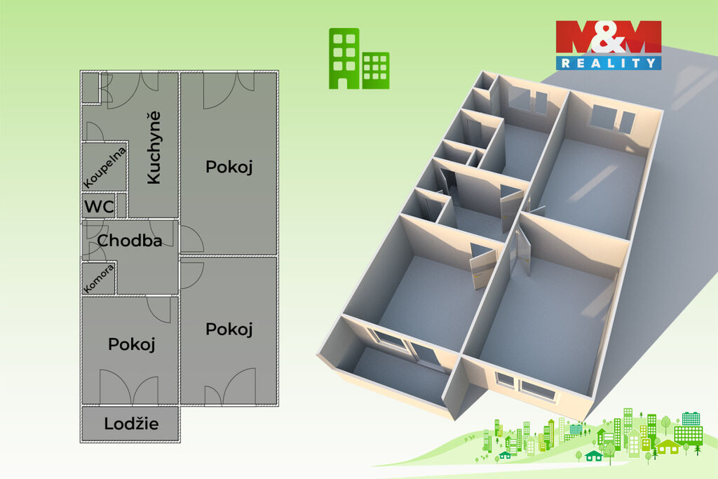 Nabízíme Vám prodej bytu s lodžií v družstevním vlastnictví o dispozici 3+1 s možností okamžitého převodu do osobního vlastnictví a dobrou dostupností do centra města. Bytová jednotka je v původním stavu s postupnými renovacemi a nachází se ve třetím patře revitalizovaného, panelového domu s plastovými okny. Dispozičně řešena dvěma neprůchozími pokoji, průchozím obývacím pokojem, kuchyní s jídelnou, koupelnou, oddělenou toaletou a prostornou chodbou s šatnou. Vytápění a ohřev vody řeší dálková distribuce. Součástí prodeje je podíl na společných částech domu zajišťující vstup do společných prostor a vlastní sklepní kóji. V nedaleké vzdálenosti je veškerá občanská vybavenost. Pro podrobnější informace, či domluvení prohlídky kontaktujte makléře. Návrh nejvhodnějšího financování Vám na míru zpracuje náš hypoteční specialista. Doporučujeme prohlídku.