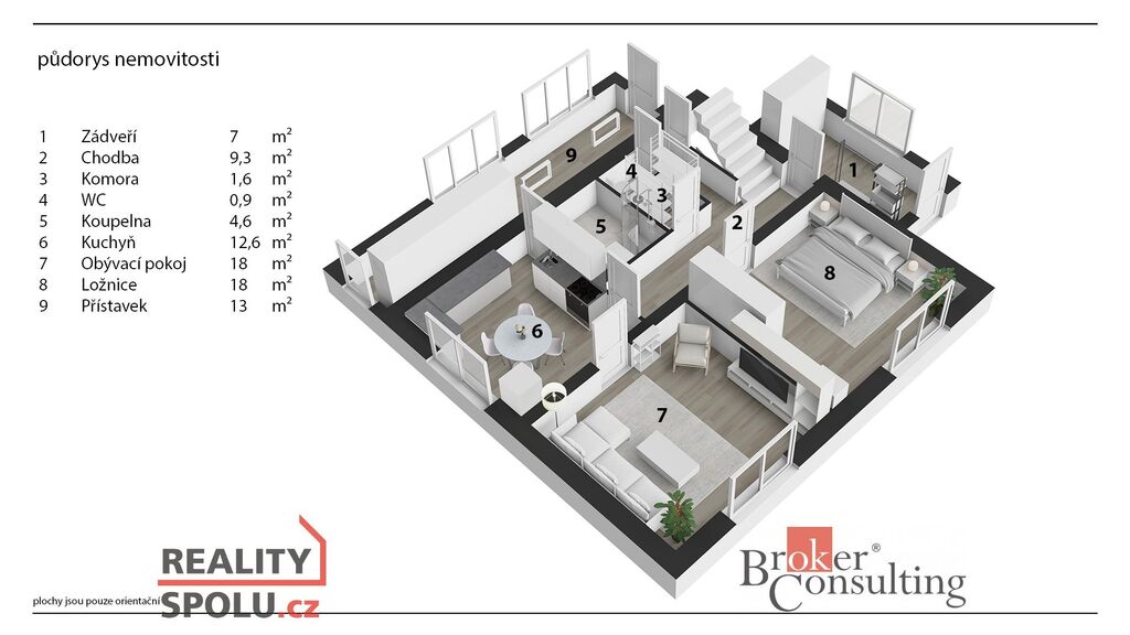 zádveří, chodba, komora, WC, koupelna, kuchyň, obývací pokoj, ložnice a přístavek