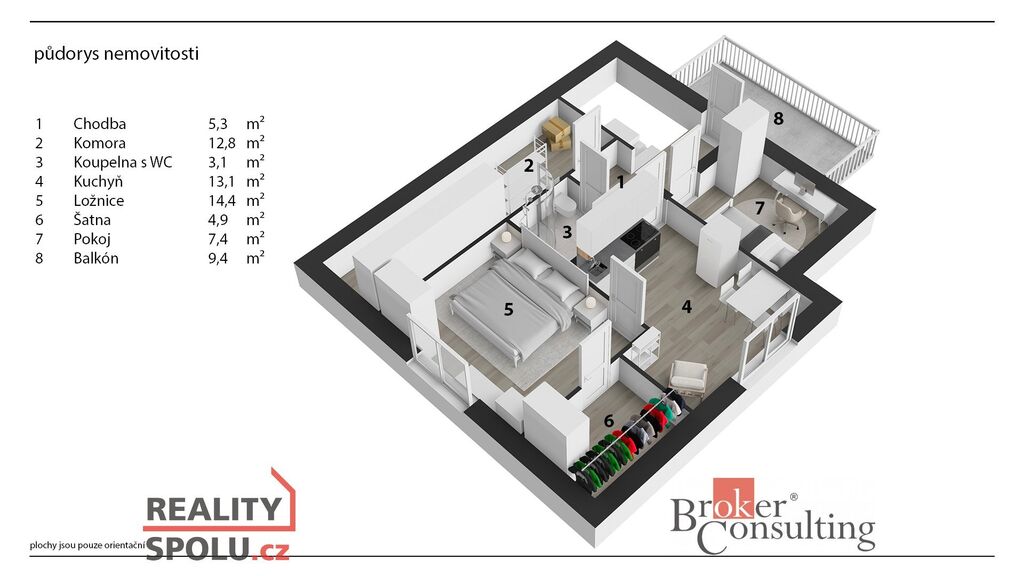 chodba, komora, koupelna s WC, kuchyň, ložnice, šatna, pokoj a balkon