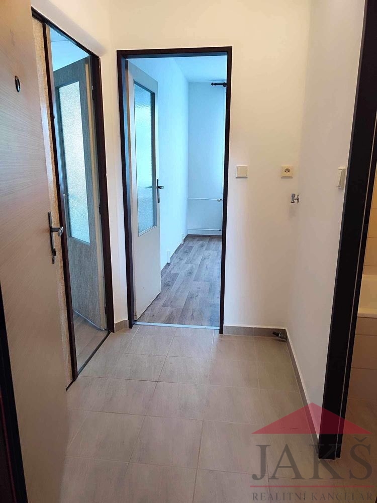 Popis: předsíň (vývody pro pračku), nová zděná koupelna (vana se sprchou, umyvadlo se zrcadlem, WC), obytná kuchyně (kuchyňská linka s HV troubou se sklo-keramickou deskou a digestoří) a prostorný pokoj.
