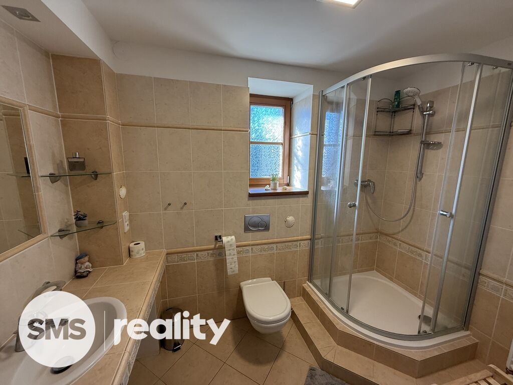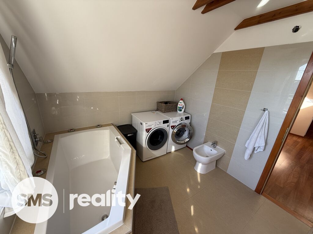 1. patro: chodba, tři samostatné pokoje (jeden s balkonem), koupelna s vanou, dvěma umyvadly, bidetem, pračkou a sušičkou, samostatné WC.
