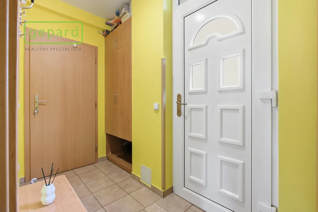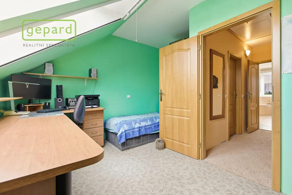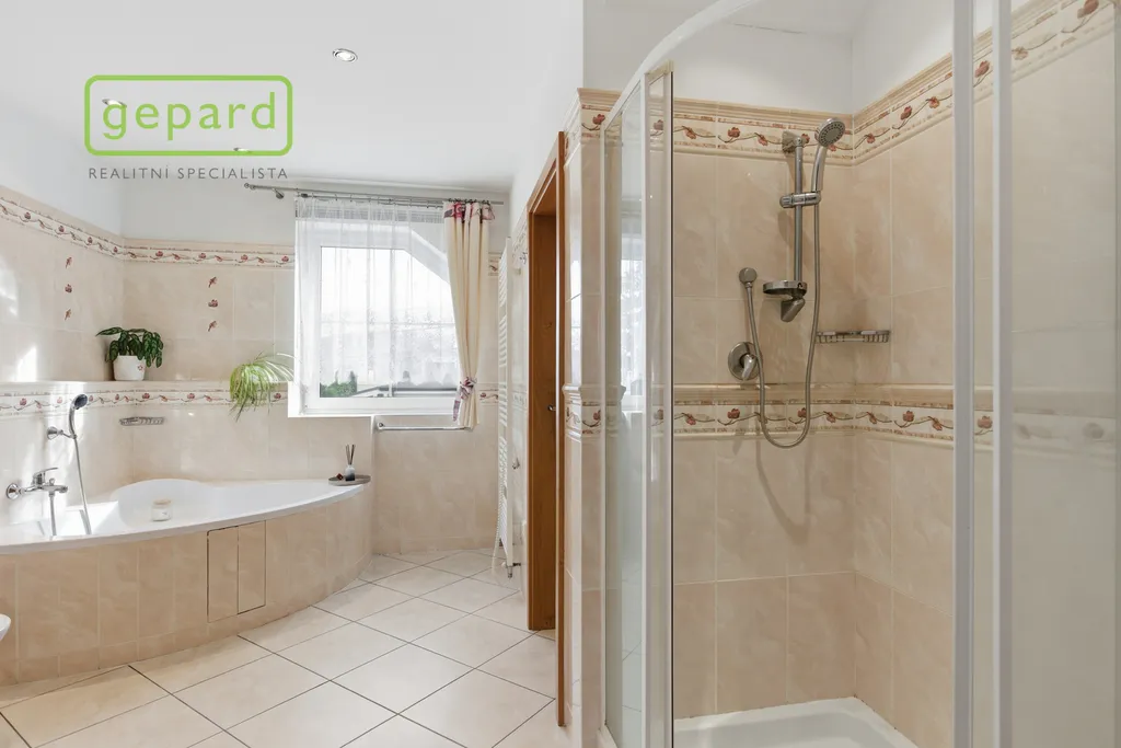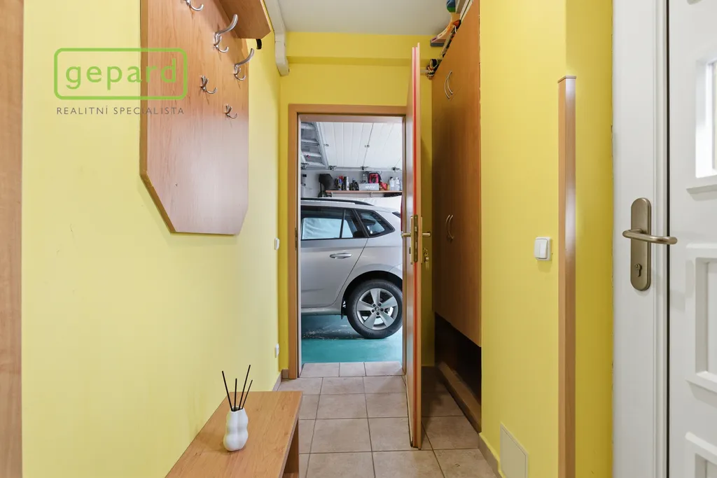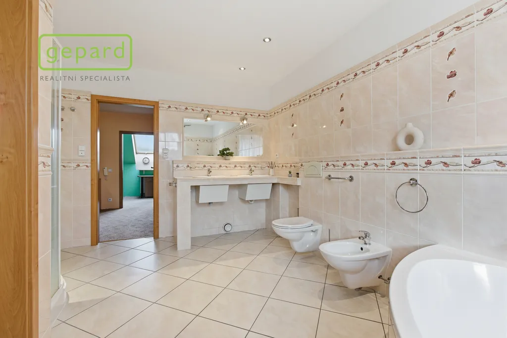 Nechybí zde ani praktické prvky jako komora, spíž, samostatné WC a vstup do garáže přímo z domu. V patře najdete tři samostatné pokoje, velkou koupelnu s vanou, sprchovým koutem, WC a bidetem, technickou místnost (např. pro pračku a sušičku) i další úložný prostor s výlezem na půdu.