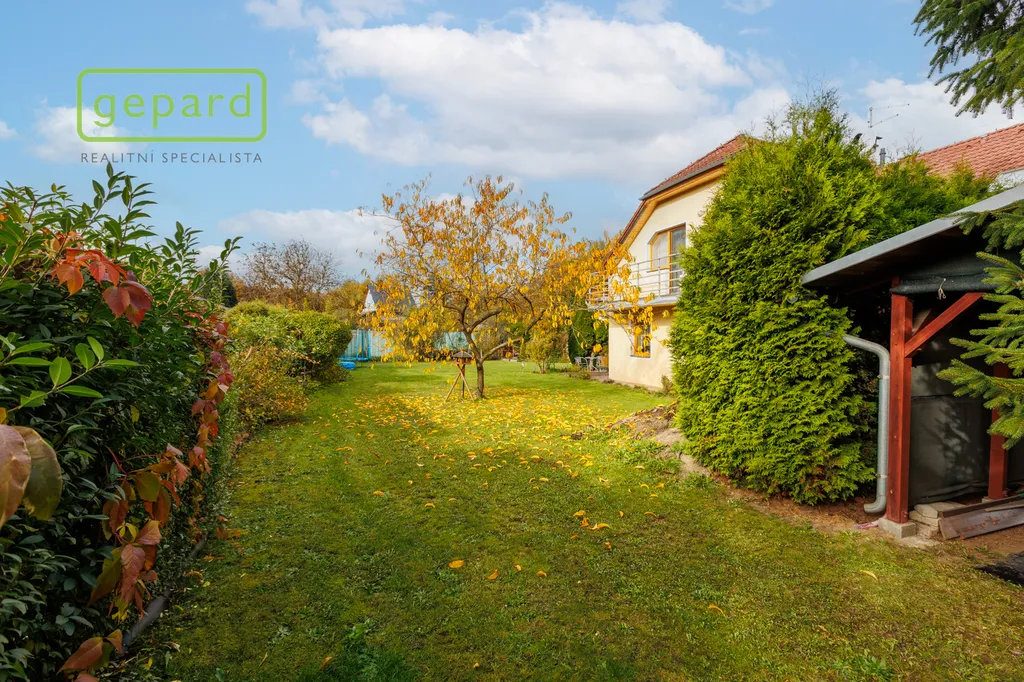 Pozemek o velikosti 963 m² je kompletně oplocený, s krytou pergolou, zahradním domkem a dálkově ovládanou bránou.