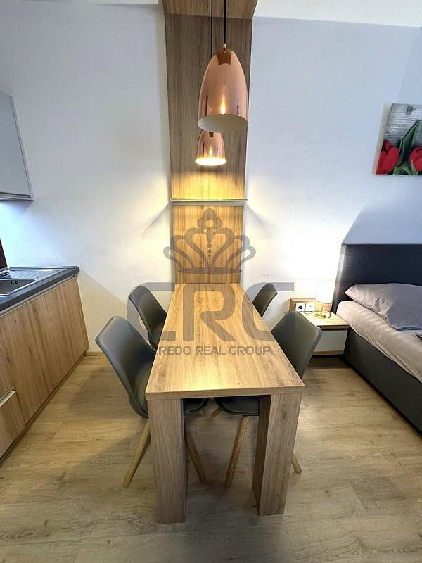 Vchodovými dveřmi vejdeme do vstupní chodby o výměře cca 4,3 m², ve které se nachází po celé její délce vestavná skříň na míru se zabudovaným bojlerem pro ohřev teplé vody. Hlavní obytná část o výměře cca 21,8 m² slouží jako kuchyně a obývací pokoj s ložnicí zároveň. Tato místnost je plně vybavena kuchyňskou linkou se čtyř plotýnkovou sklokeramickou deskou značky Elektrolux, digestoří, dřezem a lednicí s mrazákem. V pokoji je jídelní stůl se čtyřmi židlemi zajišťující komfortní stolování až čtyř osob. Nad stolem jsou dvě krásné designové lampy. V pokoji je dvojlůžko s nočními stolky a lampičkami, rozkládací gauč a nad gaučem se po žebříku dostaneme až do patrového jednolůžka. Naproti posteli je stěna s televizní skříňkou a televizí. Z obývacího pokoje je vstup na dominantu celého apartmánu, a to na terasu o výměře cca 21 m², která slouží k relaxaci a odpočinku. Na terase je venkovní posezení, a to stůl se čtyřmi židlemi. Nesmíme opomenout dřevěný prvek na terase, který je posuvný a slouží k možnému zatemnění obytné místnosti. Nesmíme opomenout nádherný výhled do okolní přírody a na sousedící hory. Poslední místností v bytě je koupelna o výměře cca 3,5 m², která disponuje velkým sprchovým koutem, WC, otopným žebříkem a umyvadlem se zrcadlem s umyvadlovou skříňkou. Koupelna je vybavena i vysoušečem vlasů.