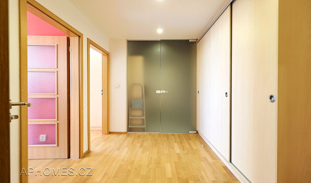 Předsíň je rozdělená skleněnou stěnou, v bytě je bodové osvětlení. Konstrukční prvky jsou v kvalitním provedení.
