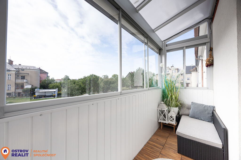 Zasklený balkon o ploše 5,4 m² s výhledem do klidného dvora. Orientovaný do vnitrobloku – ideální místo pro ranní kávu nebo večerní relax.