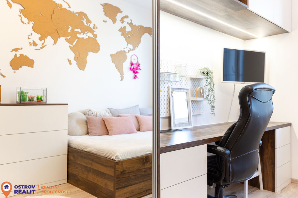 Byt je plně vybaven – prodává se včetně veškerého nábytku na míru, který byl zhotoven profesionálně s důrazem na funkčnost a design. Kuchyňská linka se spotřebiči Whirlpool (lednice, pračka, myčka nádobí, pečící trouba, varná deska (není indukční), odsavač par. Všechny postele o šířce 140 cm, pohodlné a kvalitní. Podlahy jsou plovoucí, v celém bytě je podlahové topení, které zajišťuje vysoký komfort v zimních měsících. Koupelna se sprchovým koutem, samostatné WC.