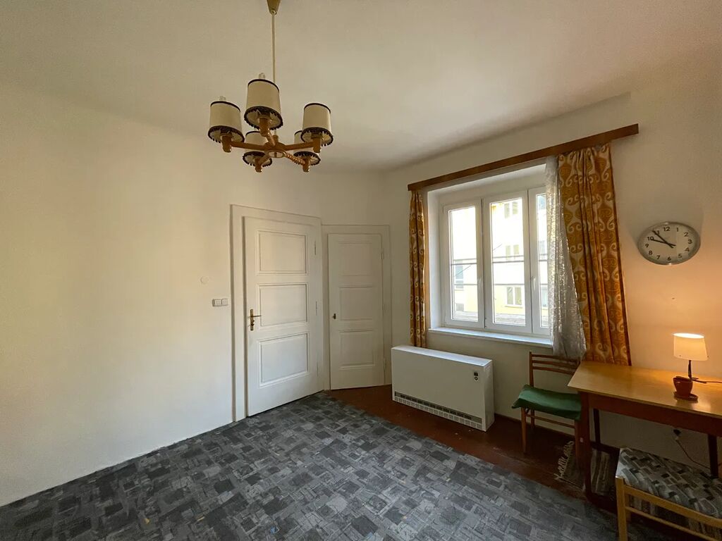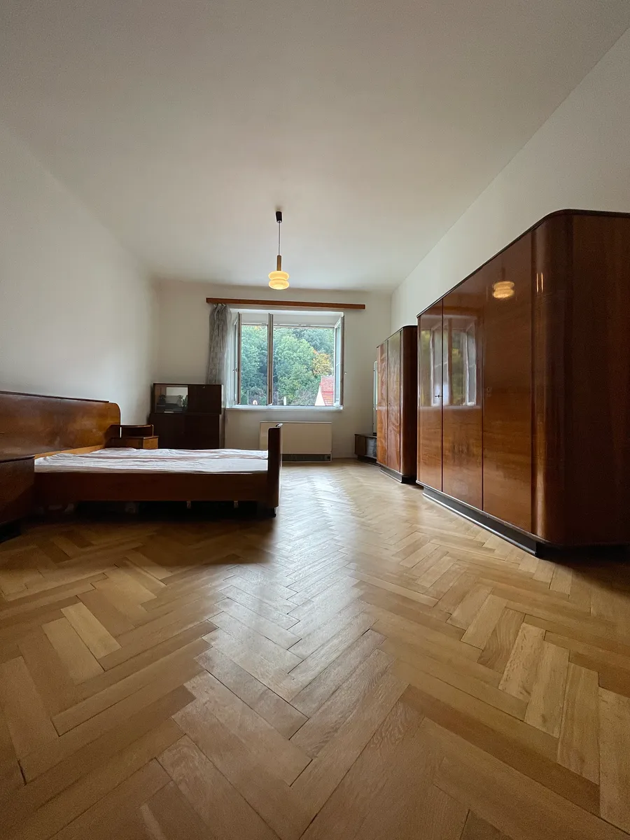 Dispozičně je byt řešen velmi prakticky. Z předsíně o velikosti 7,14 m² je vstup do všech místností: prostorného hlavního pokoje (28,73 m²) s původními dřevěnými parketami, druhého pokoje o ploše 14,8 m², dále do kuchyně s koupelnou (6,15 m²), samostatného WC (1,5 m²) a praktické spíže (1,0 m²). K bytu náleží balkon přístupný přímo z jednotky.