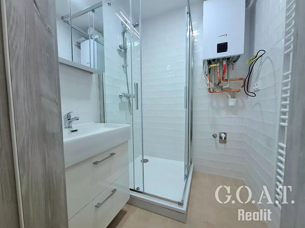 Podlahy jsou vinylové, v koupelně je dlažba, sprchový kout a plynový kotel, který zajišťuje vytápění i ohřev vody. Toaleta je samostatná.