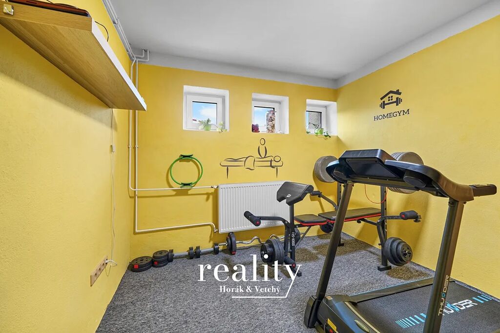 Suterén: prostorná garáž (15m2), kotelna, samostatná toaleta, vytápěná pracovna se samostatným vchodem a další místnost aktuálně využívaná jako prostor pro cvičení a relaxaci.