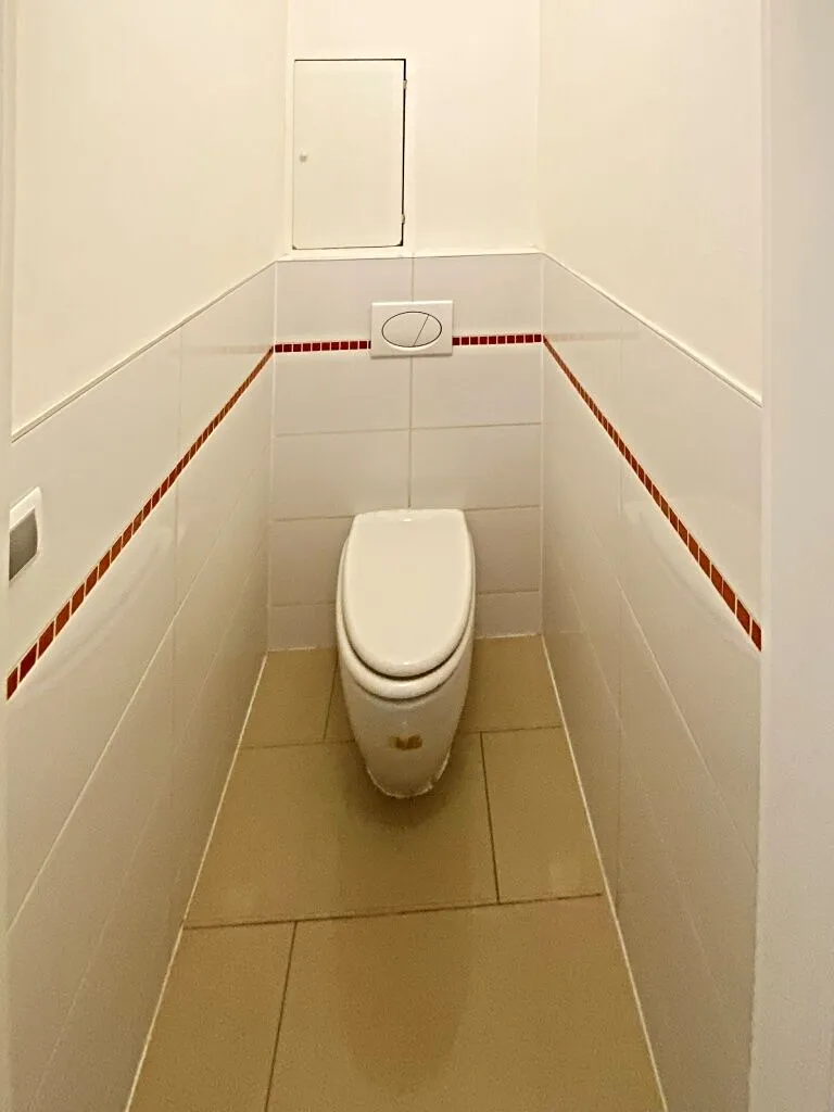 Součástí koupelny je vana, umyvadlo a pračka. Toaleta je oddělená.