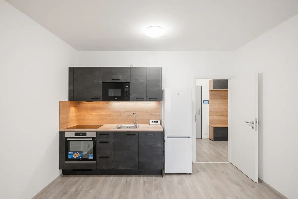 Tento byt v 1. nadzemním podlaží je tvořen obývacím pokojem s plně vybaveným kuchyňským koutem, jídelním prostorem a vstupem na balkon, ložnicí, koupelnou a předsíní.