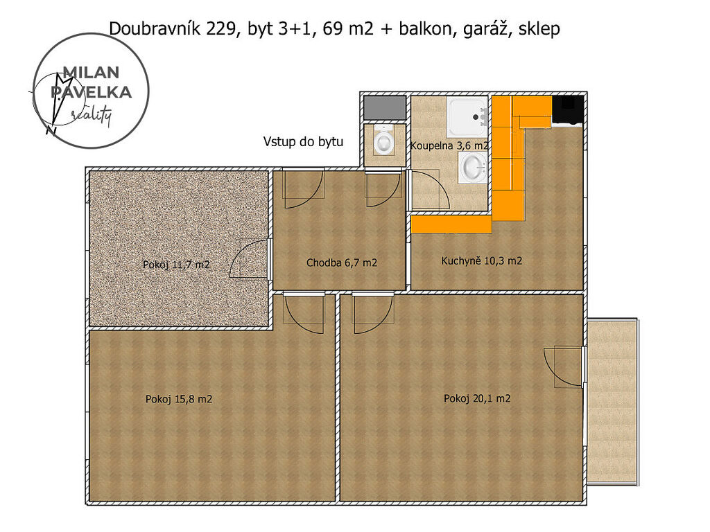 Byt o celkové ploše 69 m² + balkón se nachází v 3. NP z 3. NP. Vytápění bytu je zajištěno ústředním topením s kotlem na tuhá paliva – součinnost s topením v domě domě (jeden plný zásobník uhlí vydrží hořet 2-3 dny). Měsíční náklady na bydlení jsou 1.889 Kč (fond oprav 922 Kč, vodné a stočné 464 Kč a ostatní položky 503 Kč) + podíl na koupě uhlí (cca 22.000 Kč / rok) a energie v bytě. Okna jsou plastová izolační dvojskla s žaluziemi a se sítěmi proti hmyzu, podlahová krytina: plovoucí podlahy, PVC a dlažba. Koupelna společně s kuchyní byla rekonstruována v roce 2018. V 1. NP naleznete další součást bytu, a to sklep o výměře 7,8 m² a garáž o výměře 15 m².