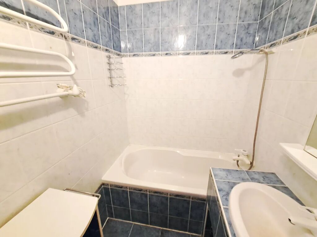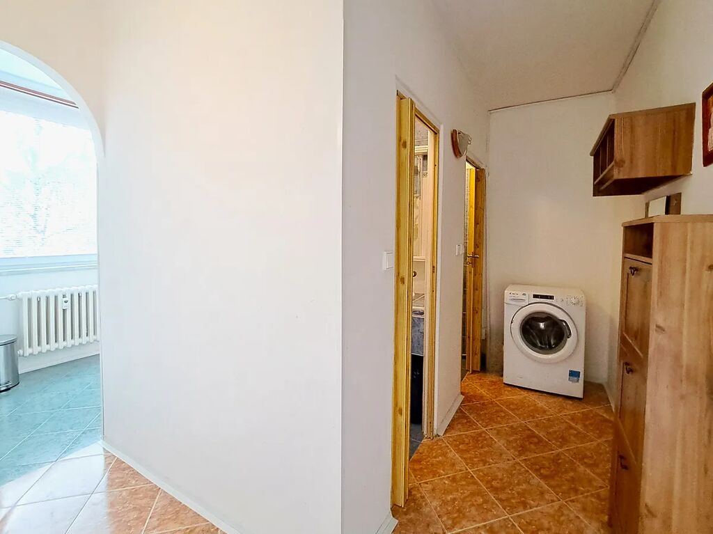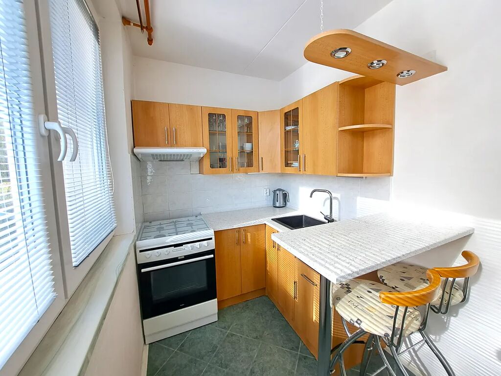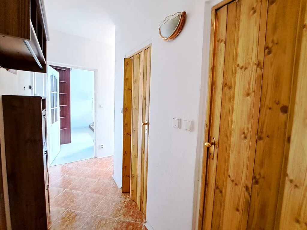 Dispozice bytu: obývací pokoj/ložnice s rozkládací sedačkou a skříněmi, chodba s pračkou a zrcadlem s věšáky, oddělené WC, koupelna s vanou a umyvadlem, kuchyň s malým ostrůvkem, sporákem a lednicí.