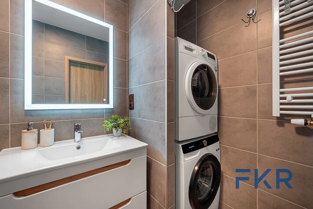 Koupelna je navržena v moderním stylu a je doplněna trendy dlažbou. Součástí prostoru je vyhrazené místo pro pračku i sušičku, což zajišťuje maximální komfort a funkčnost každodenního používání. Toaleta je umístěna samostatně.