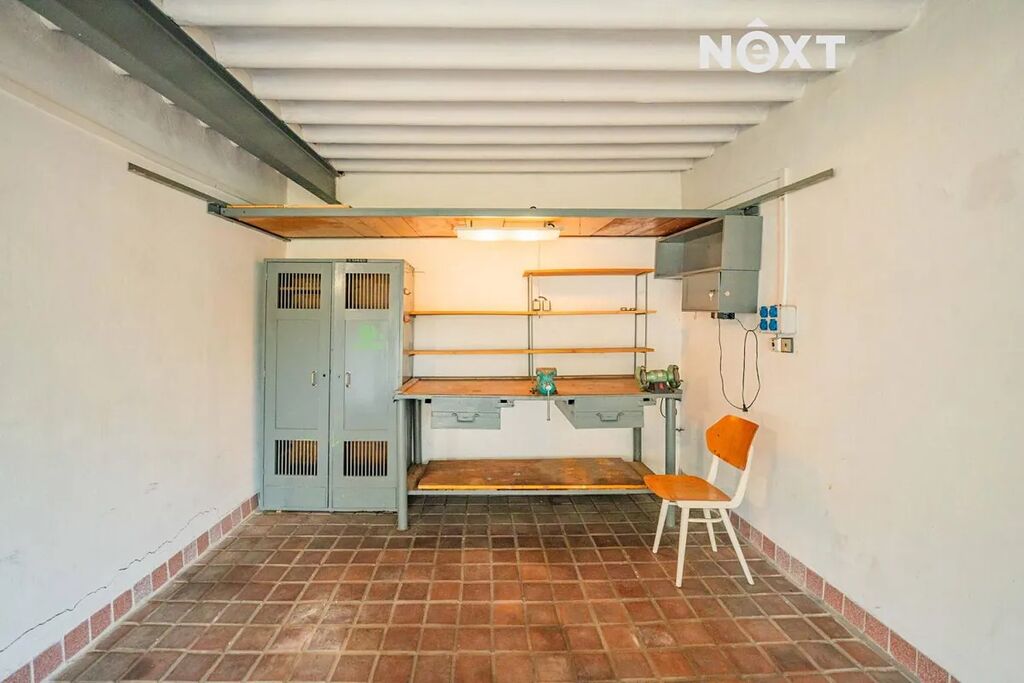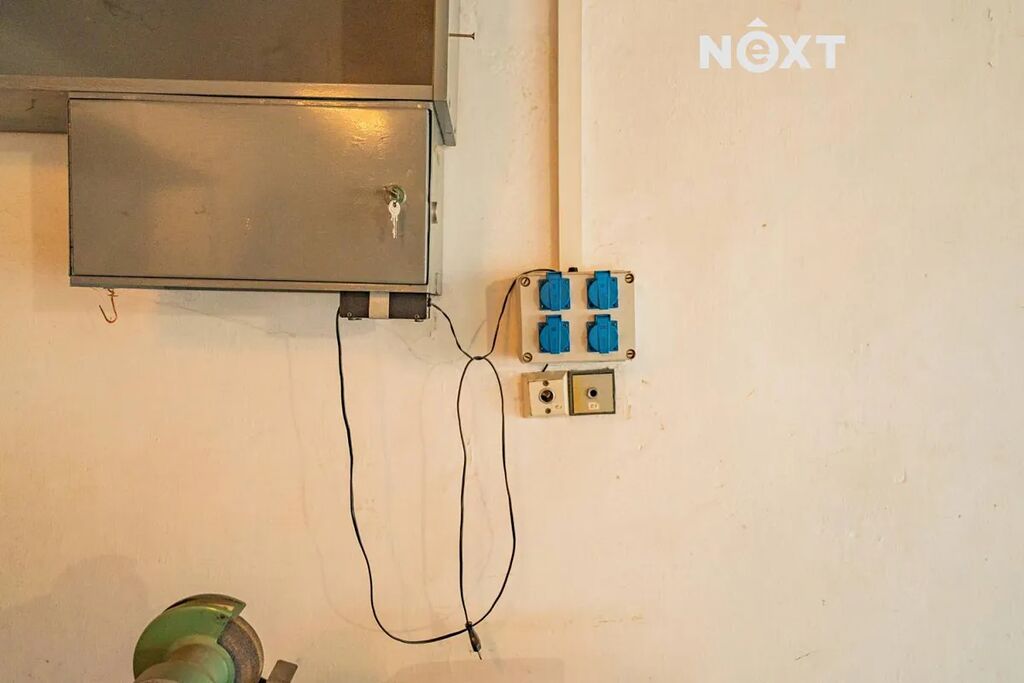Vrata jsou dřevěná, vybavená dvěma bezpečnostními zámky. Na podlaze je dlažba, která nahrazuje klasický betonový povrch. Součástí vybavení je pracovní ponk se svěrákem a bruska.