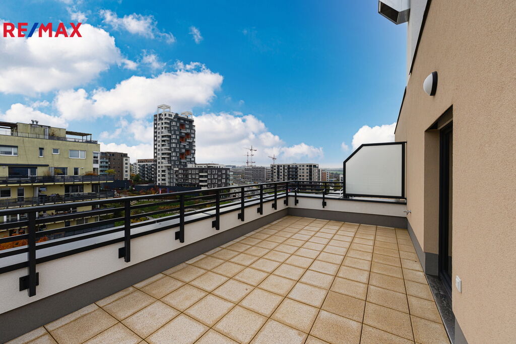 Nabízím pronájem moderního bytu 1+kk o velikosti 34 m² s prostornou terasou 35 m² a sklepní kójí 3,5 m², který se nachází v novostavbě Výhledy Barrandov II v Praze 5.