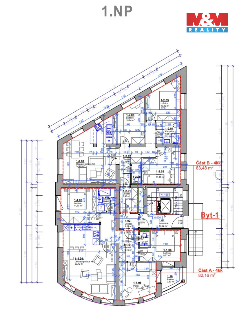 Celková plocha bytu činí 166 m² a doplňuje ji balkon o velikosti 3 m².