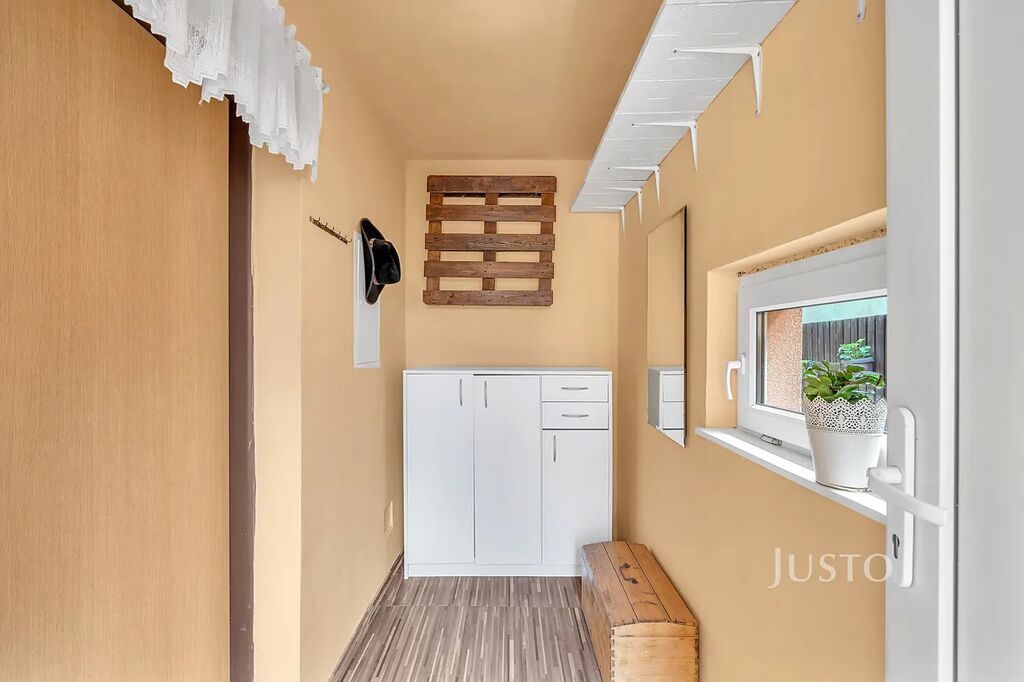 v patře pak jsou průchozí dvě ložnice a předsíň kde je schodiště a vestavěné skříně.