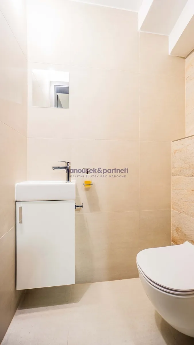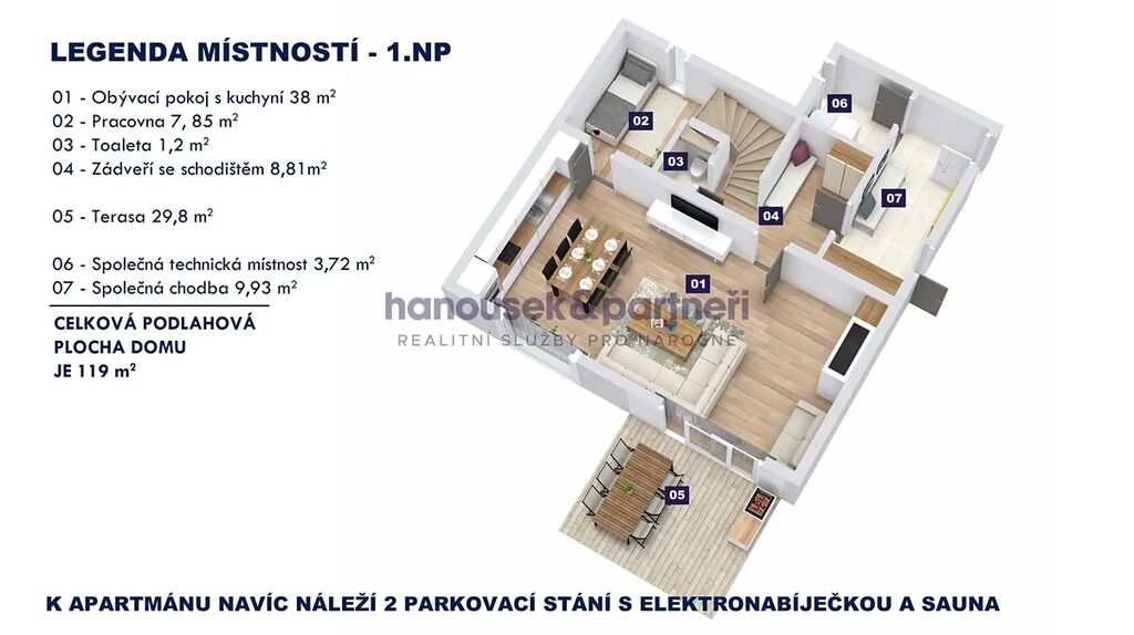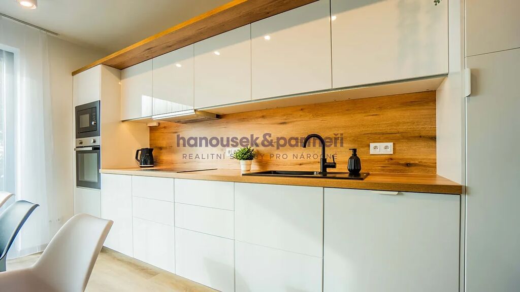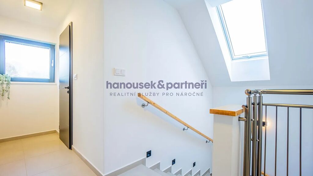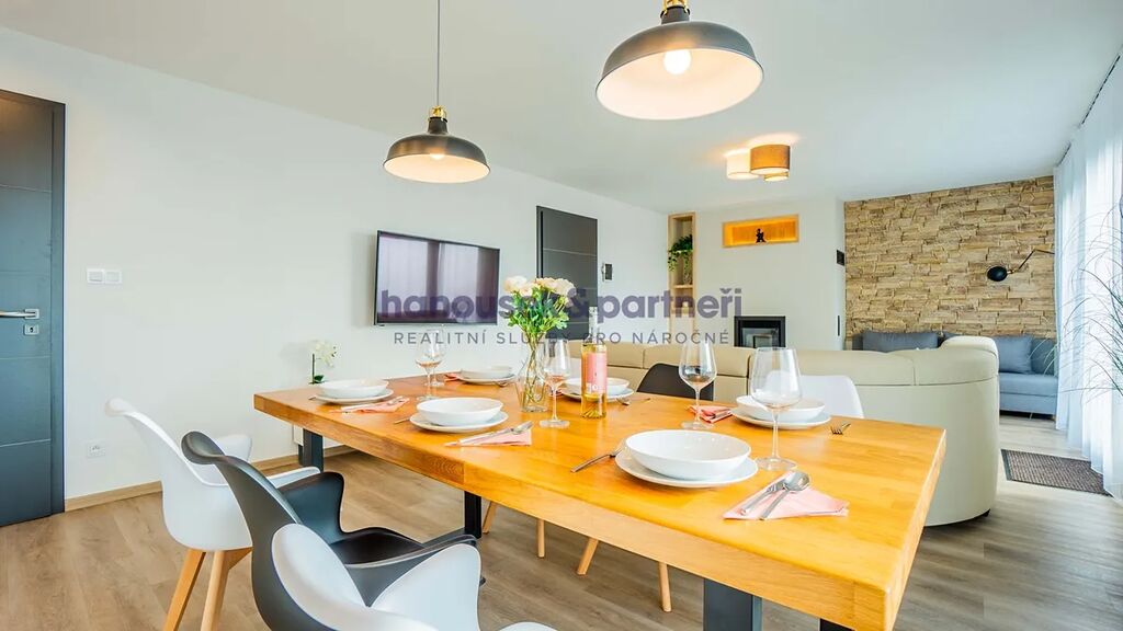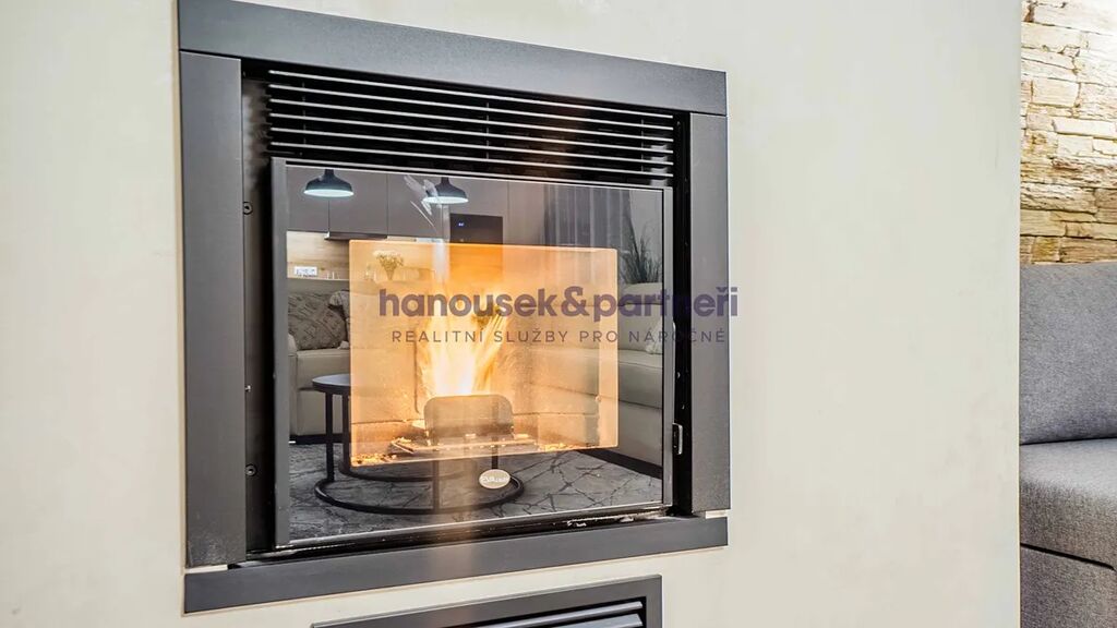 Apartmán je jedním ze dvou bytů v cihlové rodinné novostavbě. Má dispozici 3+kk a celkovou výměru 119 m2. V přízemí je obývací pokoj s kuchyní a vstupem na terasu, pracovna a samostatné WC. V patře jsou dvě ložnice a dvě koupelny.