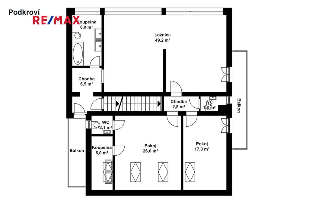 Ve druhém patře je prostorná pracovna, ložnice, 2 pokoje, 2 koupelny, 2 balkóny. Ve štítu je půda, kde je možné vybudovat další 2 místnosti, případně prostorný ateliér.