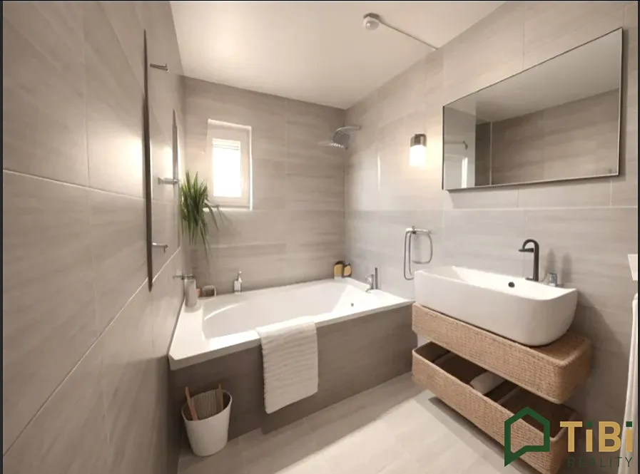 - prostornou koupelnou, nyní s vanou, ale s možností využít její rozměrové velkorysosti a přidat sprchový kout