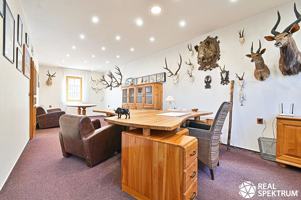 V chodbě Vás přivítá mramorová podlaha s vysokým leskem, ze které můžete směle vykročit do velkorysé kanceláře s okny na severovýchod a jihozápad, se stoly a knihovnou na míru.