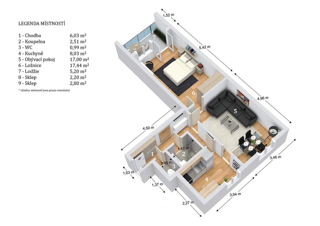 Celková užitná plocha bytu činí 62 m². Nabízí průchozí obývací pokoj přístupný z kuchyně a chodby a ložnici se vchodem na prostornou zasklenou lodžii. Koupelna je vybavena sprchovým koutem, umyvadlem, bojlerem na ohřev teplé vody a místem pro pračku. Mezi vybavení kuchyně patří lednice, plynový sporák v kombinaci s elektrickou troubou a vestavěná skříň, v níž je umístěn plynový kotel zajišťující vytápění bytu. K využívání jsou k dispozici dvě sklepní kóje (2,20 m² a 2,80 m²), které poskytují dostatek úložného prostoru. Byt je k dispozici ihned. Energetický štítek budovy: třída C.
