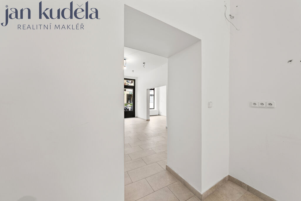 Dispozice prostoru je rozdělena na hlavní místnost o velikosti přibližně 21 m², která tvoří vstupní a klientskou část, a zadní místnost o ploše 12 m², kde se nachází přístup do skladu (4,6 m²) a sociálního zázemí (toaleta, umyvadlo). Prostor působí čistě, vzdušně a je připraven k okamžitému využití.