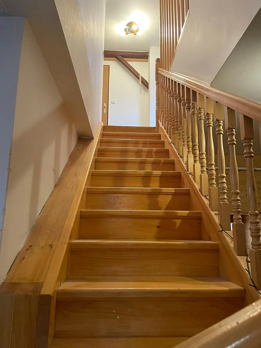 Po masivním dřevěném schodišti se dostanete do podkroví, kde se nachází předsíň, pracovna se vstupem na půdu (využívanou jako úložný prostor), dva dětské pokoje, toaleta a komora. Okna jsou plastová, v podkroví střešní značky Velux.
