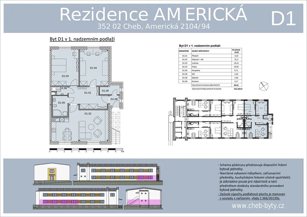 Byt D1 se nachází v 1. nadzemním podlaží bytového domu Residence Americká v Chebu. Nabízí velkorysé a moderní bydlení o dispozici 3+kk s celkovou podlahovou plochou 101,44 m².