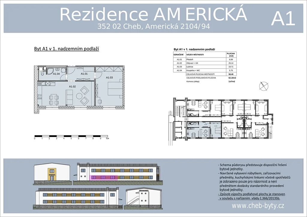 Byt A1 se nachází v 1. nadzemním podlaží domu Residence Americká v Chebu. Nabízí moderní a světlé bydlení o dispozici 2+kk s celkovou plochou 62,18 m² včetně sklepní komory.