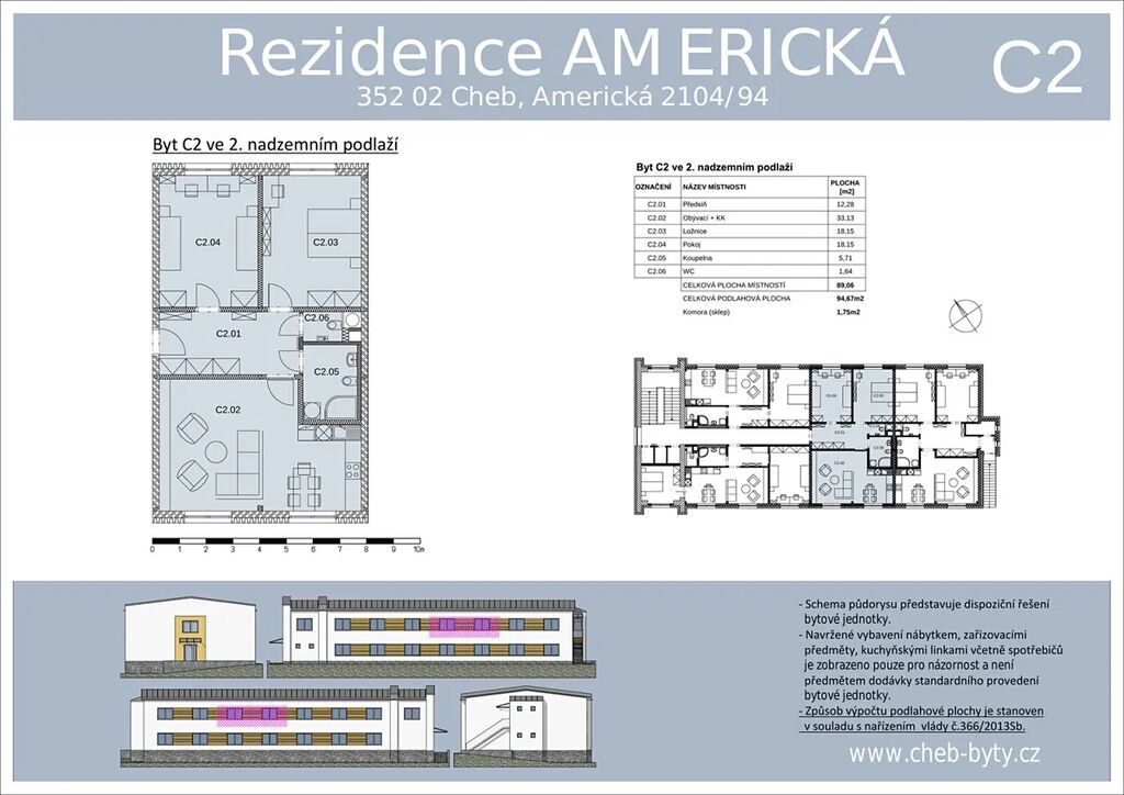 Byt C2 se nachází ve 2. nadzemním podlaží bytového domu Residence Americká v Chebu. Nabízí prostorné a moderní bydlení o dispozici 3+kk s celkovou podlahovou plochou 94,67 m², včetně sklepní komory (1,75 m²).