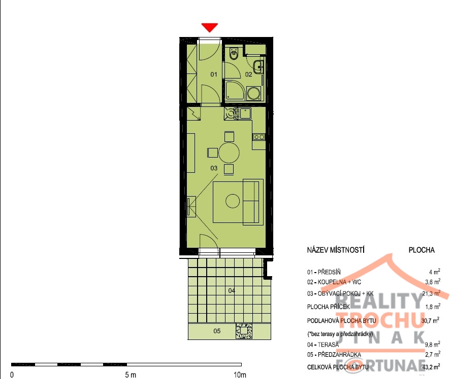 Bytová jednotka má užitnou plochu 31 m2, celková plocha 43 m2 včetně terasy (12 m2) + komora na patře (2,5 m2).