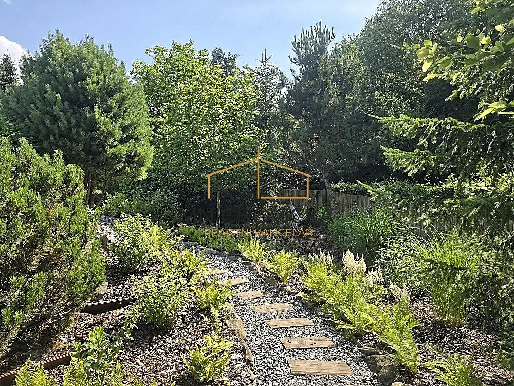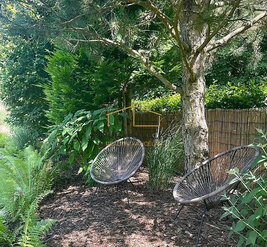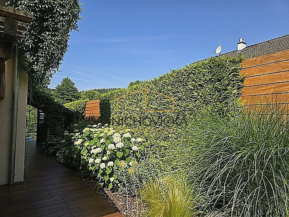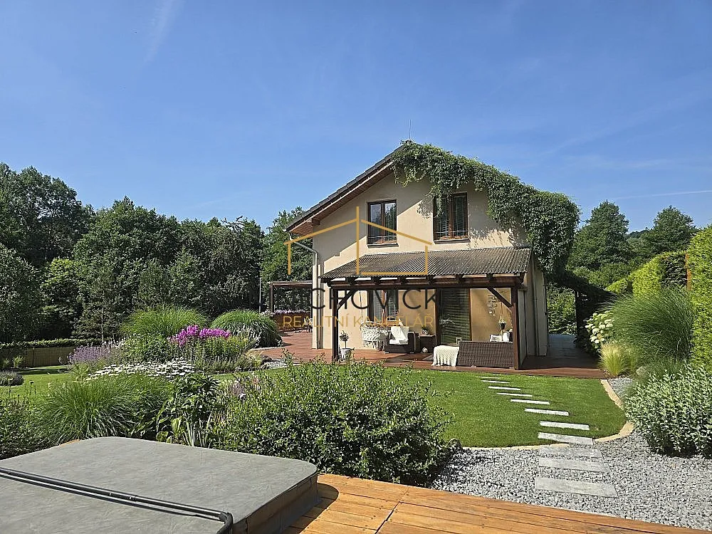 Dům stojí v krásné a udržované zahradě o výměře cca 1450 m2, se vzrostlým porostem okolo oplocení, chránícím soukromí majitelů od sousedních pozemků.