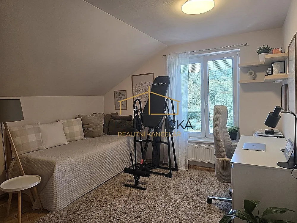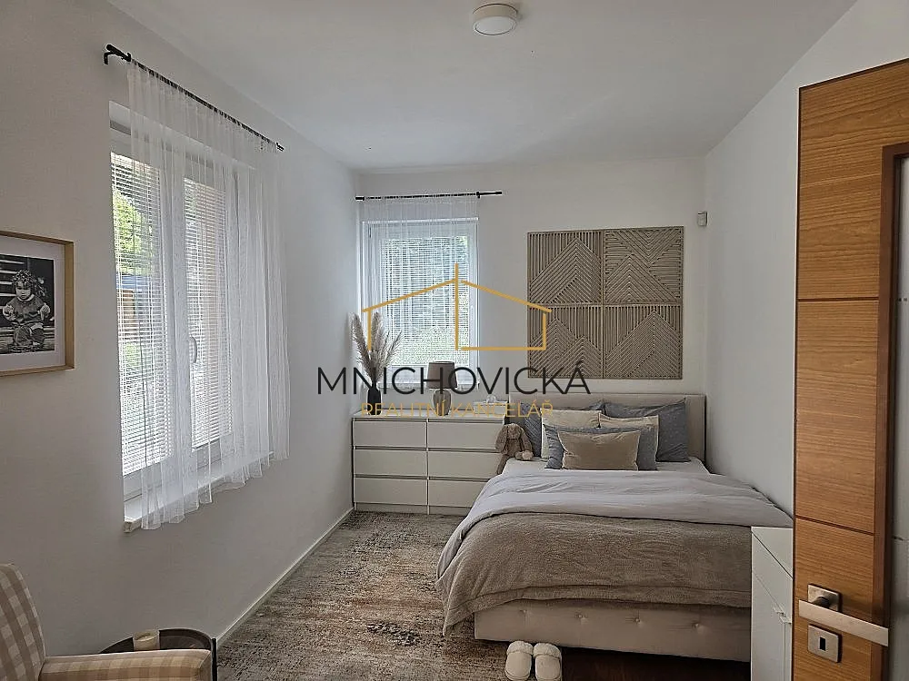 V domě jsou celkem 4 ložnice, z nich 3 patře, kde se nachází i koupelna a šatna. V přízemí je kuchyň propojená s obývacím pokojem a čtvrtá ložnice s vlastní koupelnou.