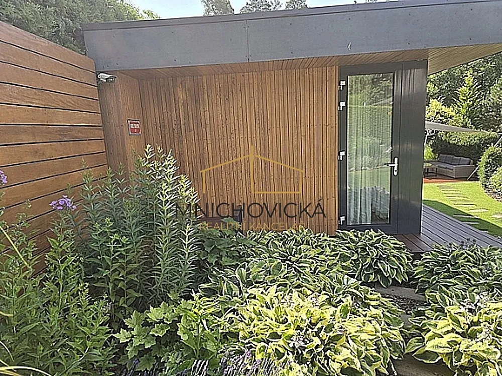 V sousedství bazénu stojí na zahradě vedlejší stavba, sloužící jako domácí posilovna, sauna a odpočívárna s projektorem a promítacím plátnem.