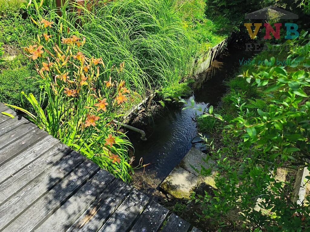Vlastní pozemek je lemován malým potůčkem a živým plotem, vedle chaty je příjemné posezení s ohništěm a udírnou.