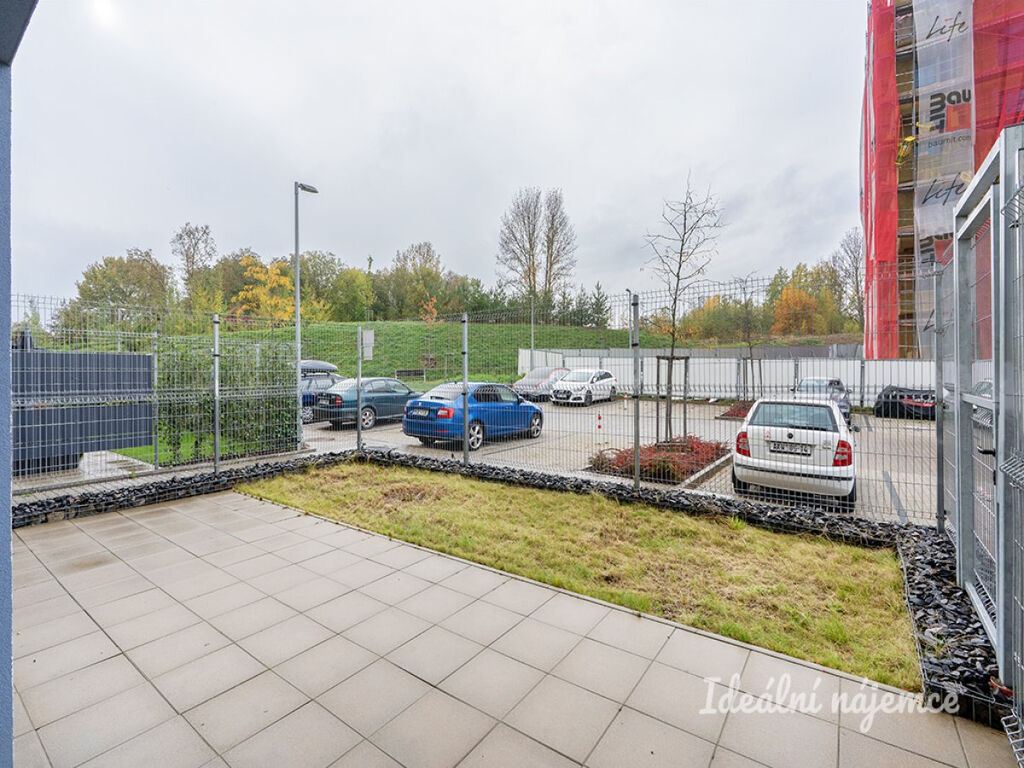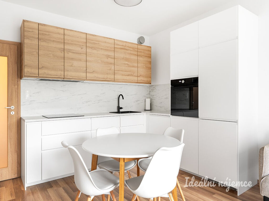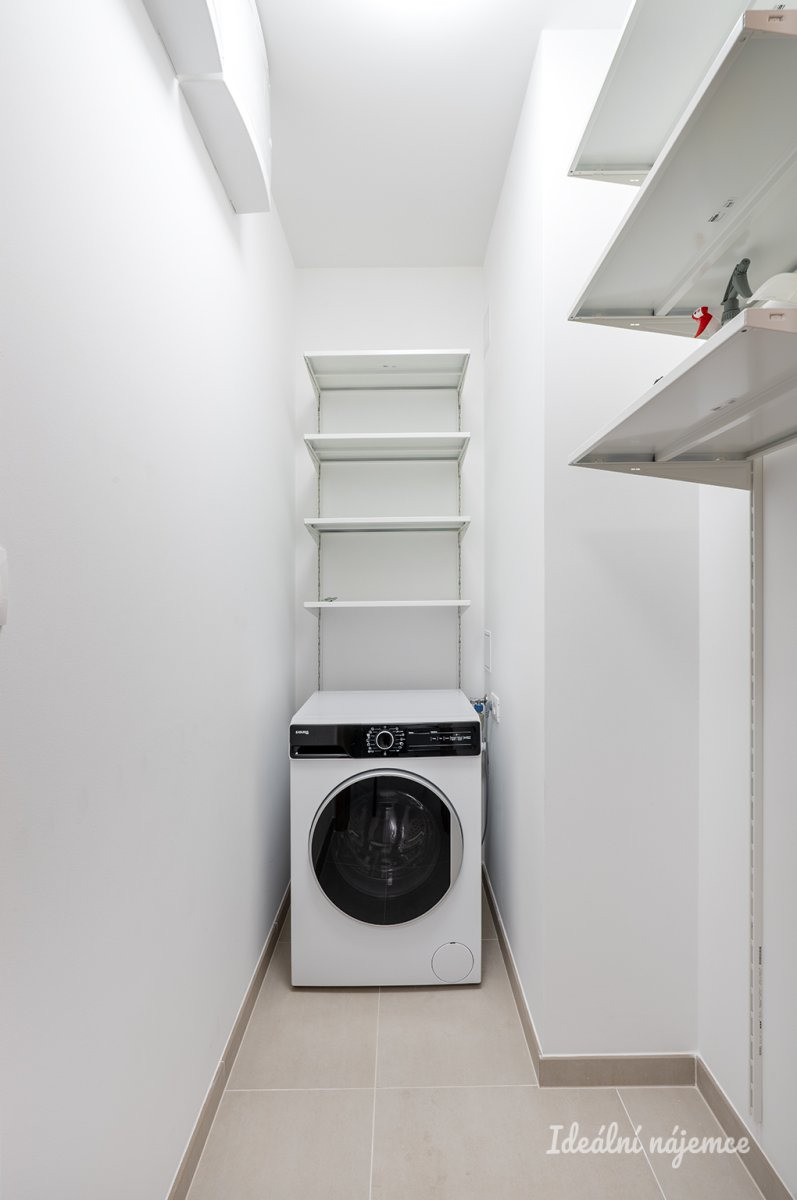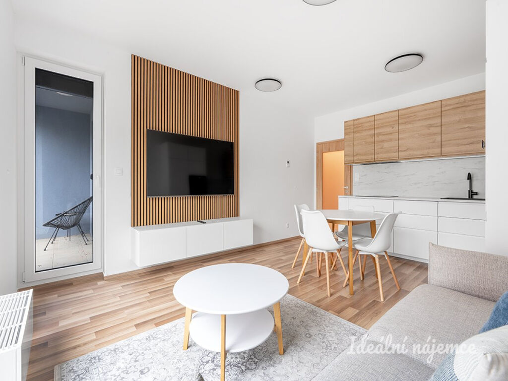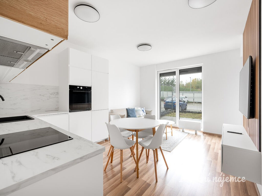 Obývací pokoj je spojený s kvalitním a praktickým kuchyňským koutem s dřezem, varnou deskou, myčkou, lednicí s mrazákem, elektrickou troubou, digestoří a dostatkem úložných prostor. Z obývacího pokoje je vstup přímo na terasu a soukromou předzahrádku. Koupelna je spojená s WC a je zde vana. Pračka je umístěna v samostatné technické místnosti. Díky vestavěným skříním je v bytě dostatek úložného prostoru.