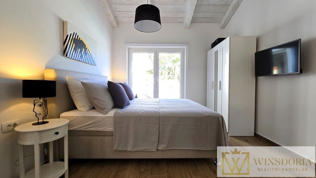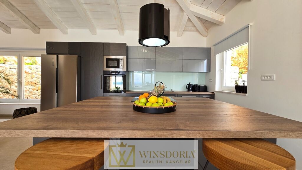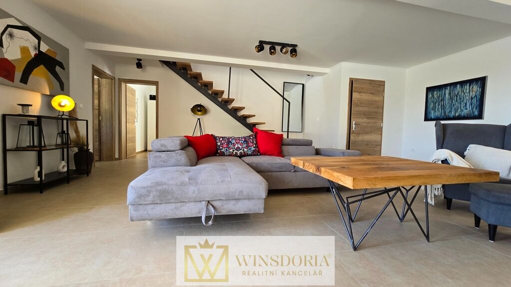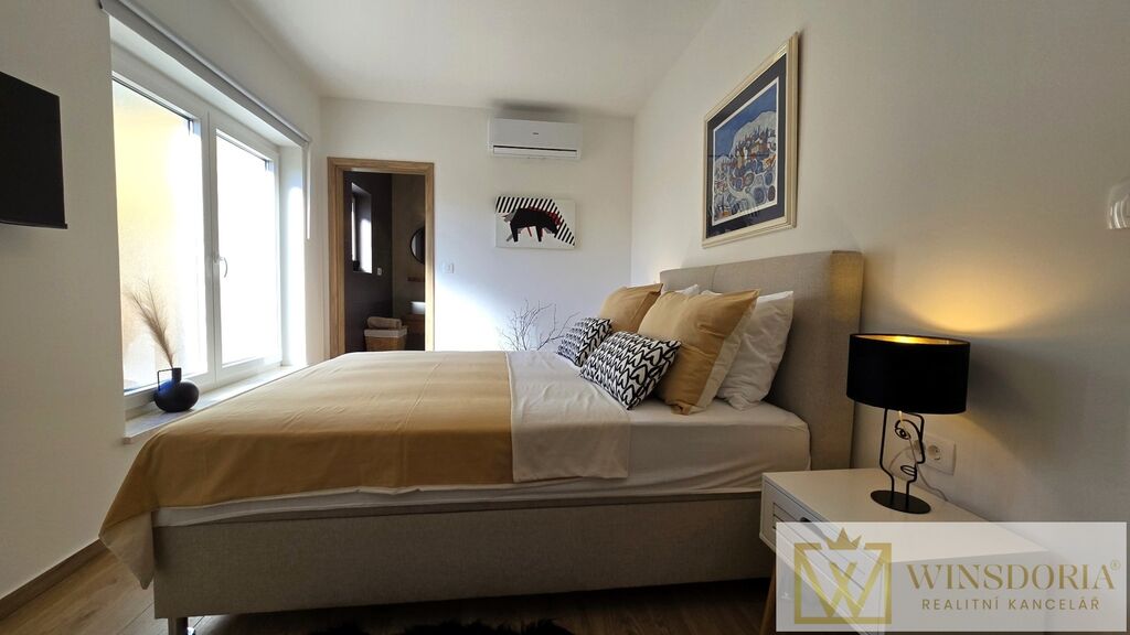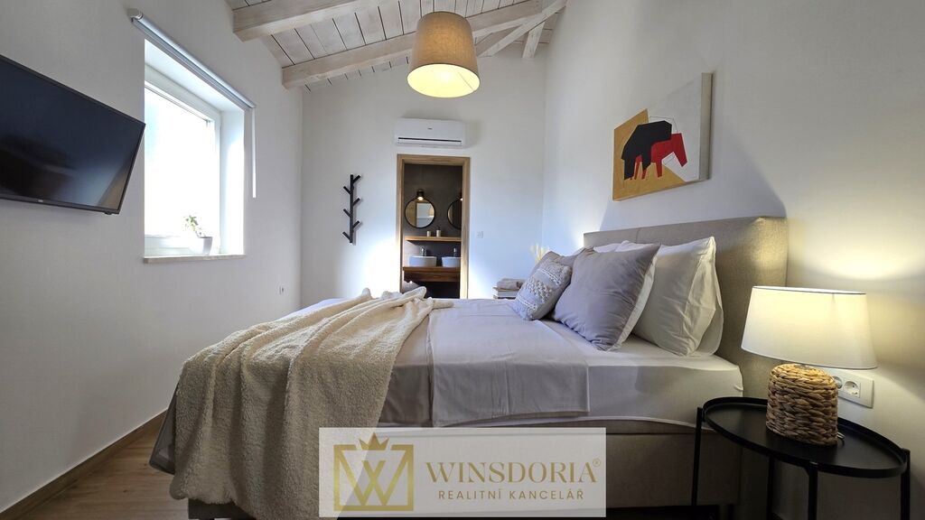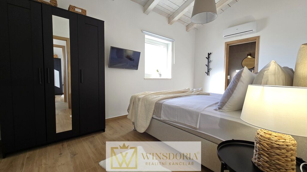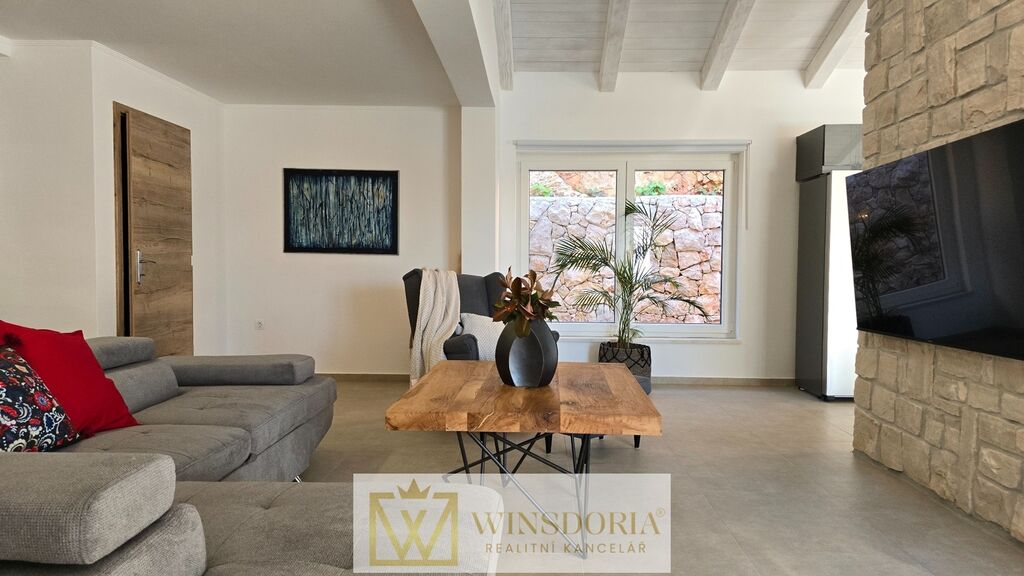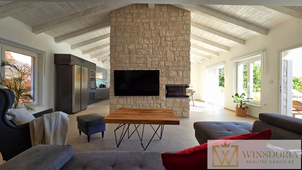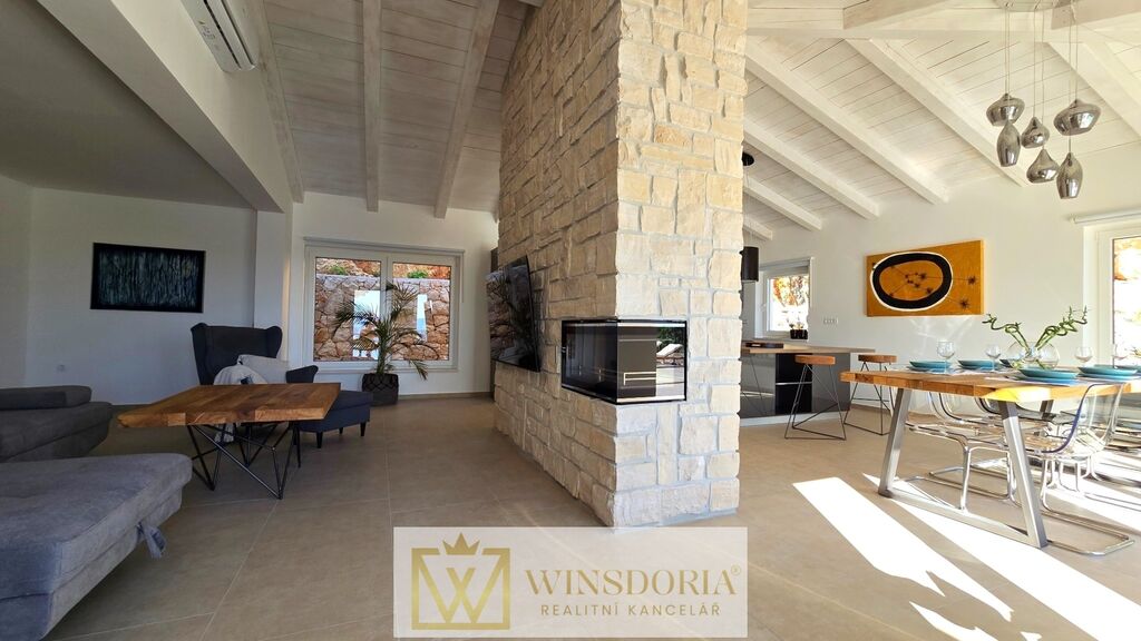 Celý interiér je klimatizován, vybaven tepelným čerpadlem s podlahovým vytápěním a stylovým krbem pro příjemné večery.